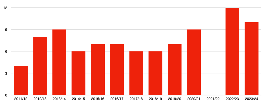 But regardless of wider opinion, the presence of Manchester City makes Arsenal’s start to the 2023/24 season difficult to assess. Performances have been reasonable as the Understat xG table will attest to. Arsenal predictably rank second in that metric, behind the Community Shield runners-up, while xG and xGC values are very closely aligned with goals scored and conceded at this early stage. Results have been fine too – one set of dropped points in a four game period is perfectly acceptable but equally not outstanding either given a fairly favourable set of fixtures. Those first four matches of course included three at home and the absence of any midweek matches. That is about to change as two games a week becomes the norm again.